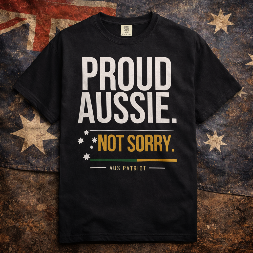 The Proud Aussie. Not Sorry. tee is for those who believe that loving Australia doesn’t require permission, explanation, or apology. It represents pride in our land, our people, our flag, and the values that built this country.